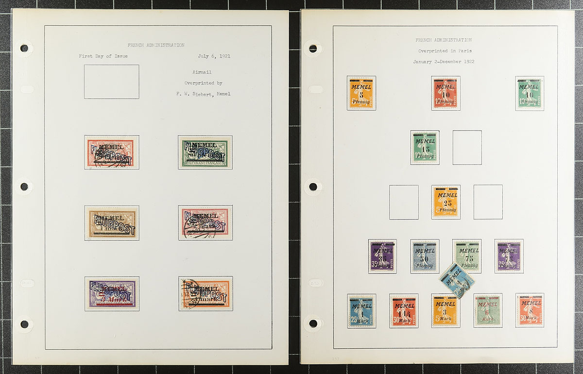 Tidy collection of mint and used Memel, 1920-1923, containing roughly 200 stamps in nicely organized homemade pages. The collection generally ranges from Scott #1/99, along with a few airmails, and several occupation stamps ranging from N1/N82. The collection contains primarily sets and partial sets, with some issues having a mint and or a used example. We noted some stamps and sets cataloguing $20 to $35 and up each. A lovely collection from an intriguing time period and should be continued until completion. Overall fine to very fine. 2026 Scott US$702.30 =