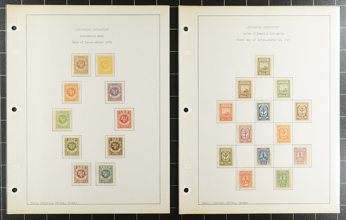 Tidy collection of mint and used Memel, 1920-1923, containing roughly 200 stamps in nicely organized homemade pages. The collection generally ranges from Scott #1/99, along with a few airmails, and several occupation stamps ranging from N1/N82. The collection contains primarily sets and partial sets, with some issues having a mint and or a used example. We noted some stamps and sets cataloguing $20 to $35 and up each. A lovely collection from an intriguing time period and should be continued until completion. Overall fine to very fine. 2026 Scott US$702.30 =