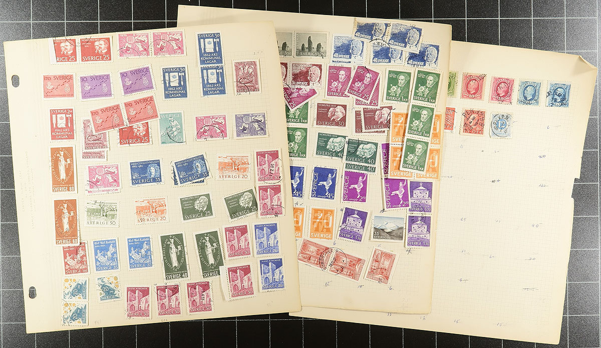 Old-time unpicked used accumulation of Sweden, 1870's-1979, containing a few thousand stamps in several homemade and manila stockpages. The lot has a degree of organization on some pages, generally ranging from Scott #17/1291, noting several Numeral issues, along with semi-postals and official stamps. The lot appears to be the collector duplicates, but some poking around spotted Scott #20 (x2, used, c.v. $80 total), along with accumulation of issues collected for town postmarks, leaving plenty of finds for the dedicated collector. A very worthwhile lot for the Sweden collector, and the first time on the market in several decades. Should be worth our conservative estimate. Estimate =
