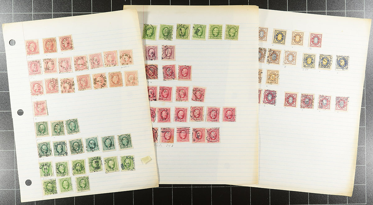 Old-time unpicked used accumulation of Sweden, 1870's-1979, containing a few thousand stamps in several homemade and manila stockpages. The lot has a degree of organization on some pages, generally ranging from Scott #17/1291, noting several Numeral issues, along with semi-postals and official stamps. The lot appears to be the collector duplicates, but some poking around spotted Scott #20 (x2, used, c.v. $80 total), along with accumulation of issues collected for town postmarks, leaving plenty of finds for the dedicated collector. A very worthwhile lot for the Sweden collector, and the first time on the market in several decades. Should be worth our conservative estimate. Estimate =