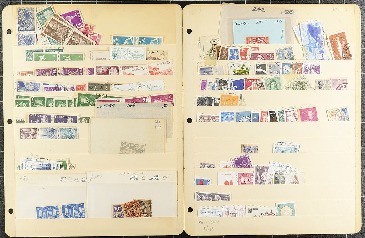 Old-time unpicked used accumulation of Sweden, 1870's-1979, containing a few thousand stamps in several homemade and manila stockpages. The lot has a degree of organization on some pages, generally ranging from Scott #17/1291, noting several Numeral issues, along with semi-postals and official stamps. The lot appears to be the collector duplicates, but some poking around spotted Scott #20 (x2, used, c.v. $80 total), along with accumulation of issues collected for town postmarks, leaving plenty of finds for the dedicated collector. A very worthwhile lot for the Sweden collector, and the first time on the market in several decades. Should be worth our conservative estimate. Estimate =