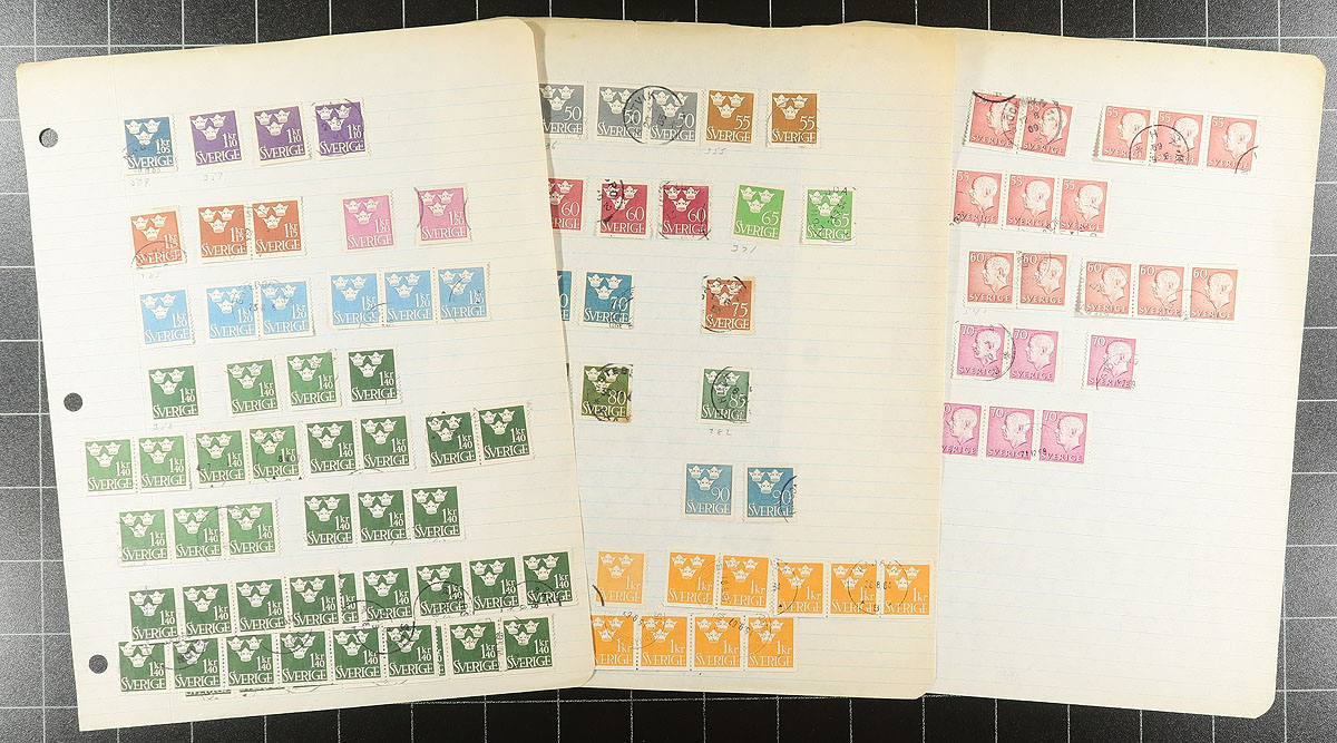 Old-time unpicked used accumulation of Sweden, 1870's-1979, containing a few thousand stamps in several homemade and manila stockpages. The lot has a degree of organization on some pages, generally ranging from Scott #17/1291, noting several Numeral issues, along with semi-postals and official stamps. The lot appears to be the collector duplicates, but some poking around spotted Scott #20 (x2, used, c.v. $80 total), along with accumulation of issues collected for town postmarks, leaving plenty of finds for the dedicated collector. A very worthwhile lot for the Sweden collector, and the first time on the market in several decades. Should be worth our conservative estimate. Estimate =