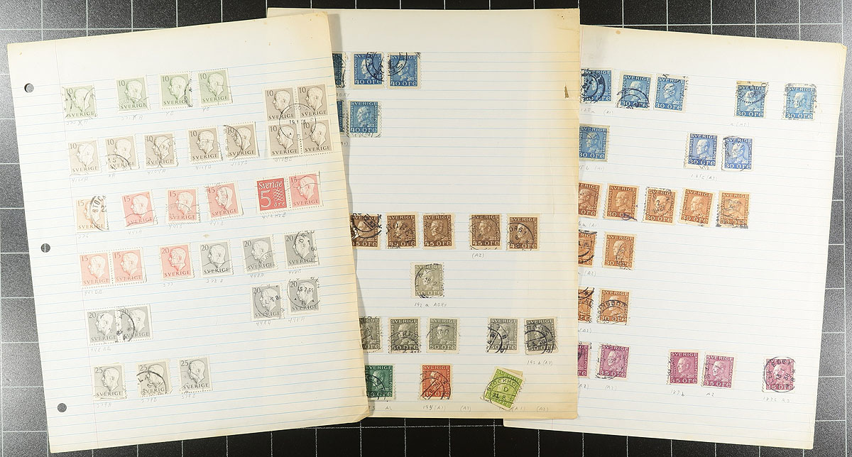 Old-time unpicked used accumulation of Sweden, 1870's-1979, containing a few thousand stamps in several homemade and manila stockpages. The lot has a degree of organization on some pages, generally ranging from Scott #17/1291, noting several Numeral issues, along with semi-postals and official stamps. The lot appears to be the collector duplicates, but some poking around spotted Scott #20 (x2, used, c.v. $80 total), along with accumulation of issues collected for town postmarks, leaving plenty of finds for the dedicated collector. A very worthwhile lot for the Sweden collector, and the first time on the market in several decades. Should be worth our conservative estimate. Estimate =