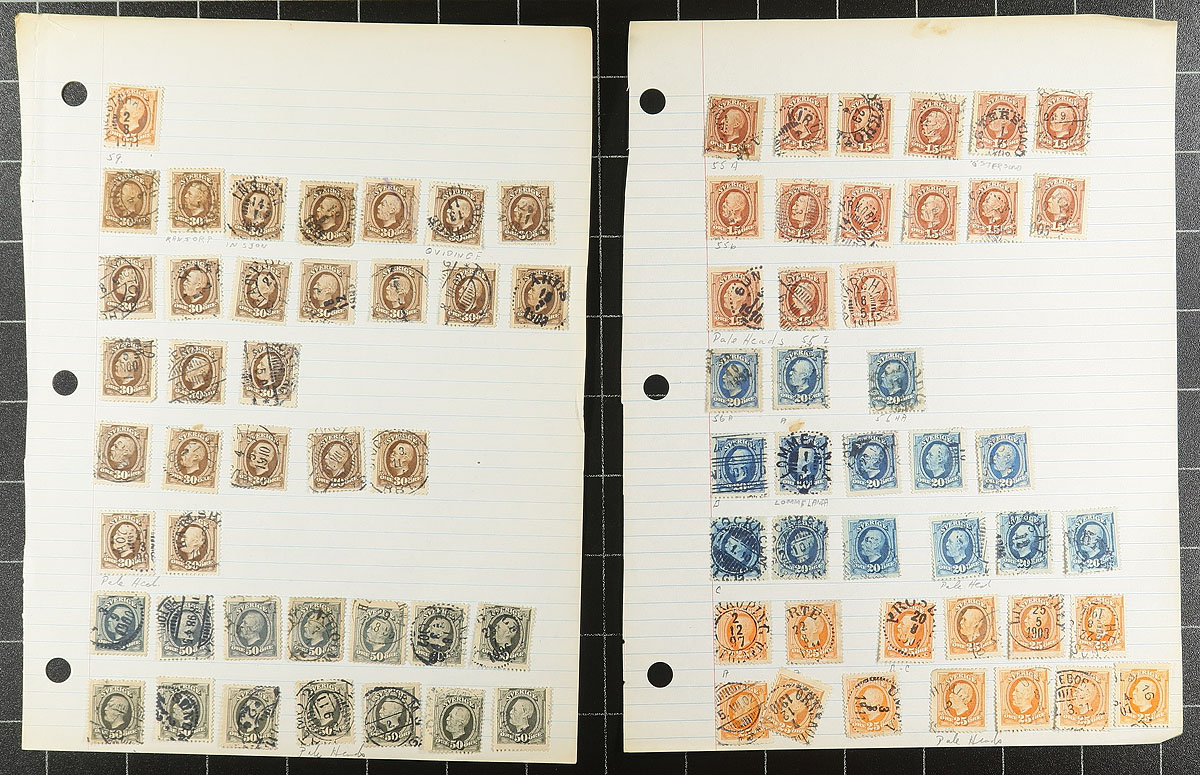 Old-time unpicked used accumulation of Sweden, 1870's-1979, containing a few thousand stamps in several homemade and manila stockpages. The lot has a degree of organization on some pages, generally ranging from Scott #17/1291, noting several Numeral issues, along with semi-postals and official stamps. The lot appears to be the collector duplicates, but some poking around spotted Scott #20 (x2, used, c.v. $80 total), along with accumulation of issues collected for town postmarks, leaving plenty of finds for the dedicated collector. A very worthwhile lot for the Sweden collector, and the first time on the market in several decades. Should be worth our conservative estimate. Estimate =