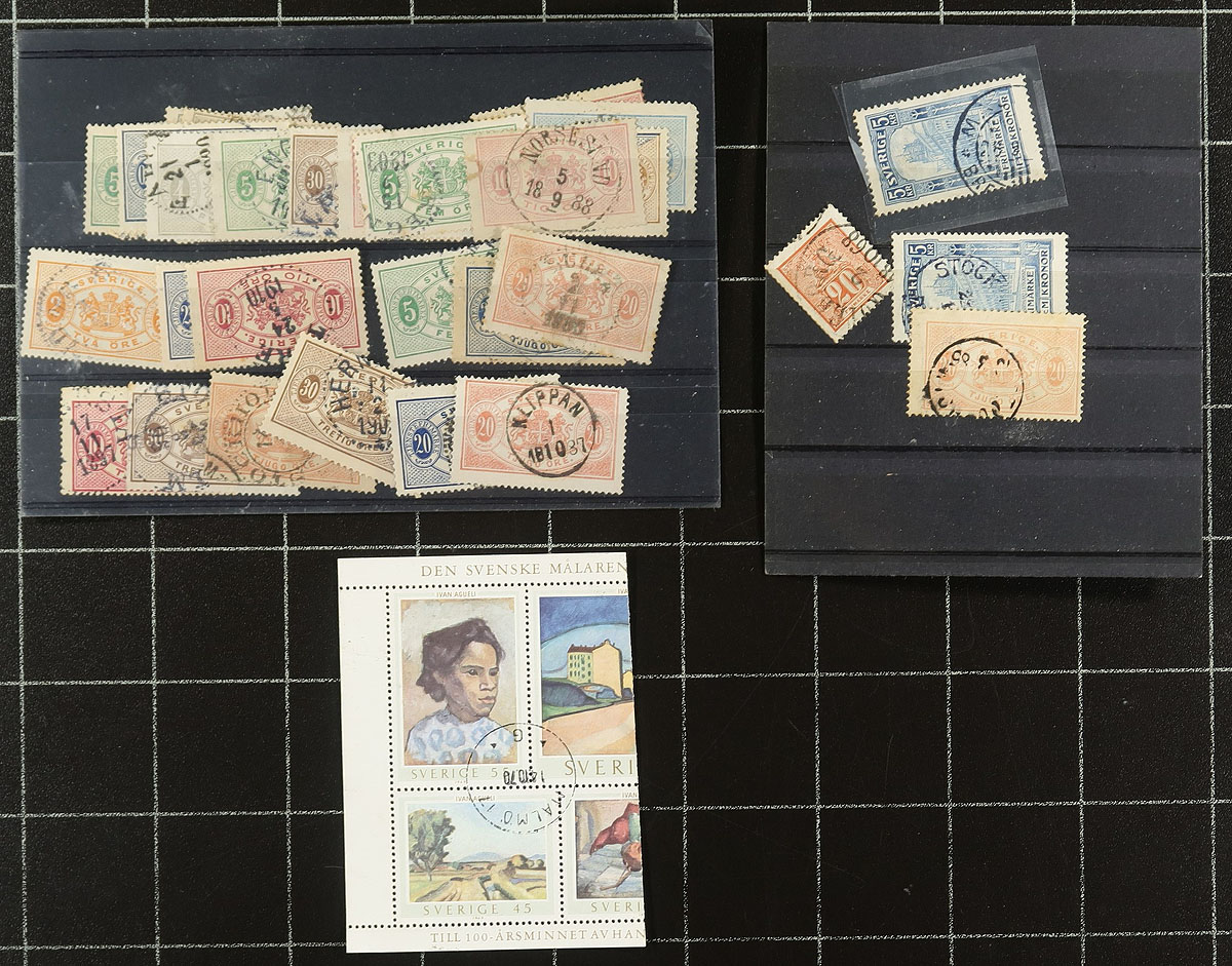 Old-time unpicked used accumulation of Sweden, 1870's-1979, containing a few thousand stamps in several homemade and manila stockpages. The lot has a degree of organization on some pages, generally ranging from Scott #17/1291, noting several Numeral issues, along with semi-postals and official stamps. The lot appears to be the collector duplicates, but some poking around spotted Scott #20 (x2, used, c.v. $80 total), along with accumulation of issues collected for town postmarks, leaving plenty of finds for the dedicated collector. A very worthwhile lot for the Sweden collector, and the first time on the market in several decades. Should be worth our conservative estimate. Estimate =