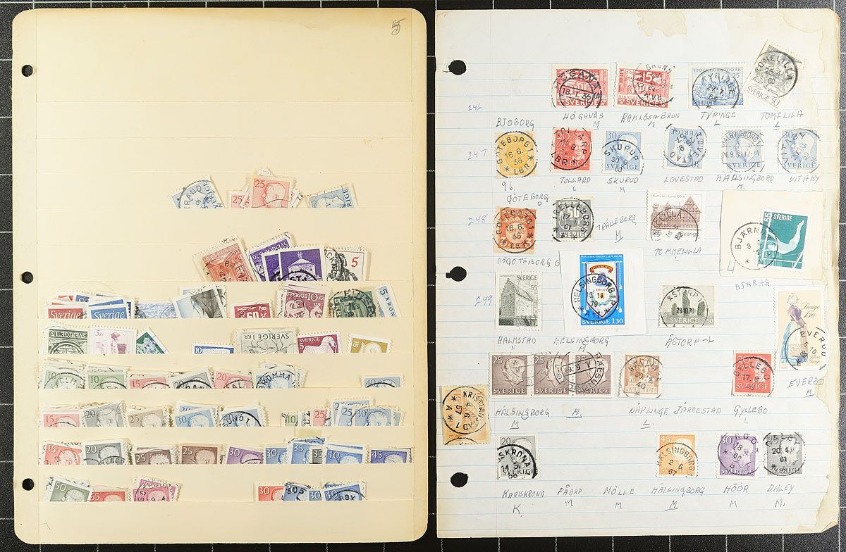 Old-time unpicked used accumulation of Sweden, 1870's-1979, containing a few thousand stamps in several homemade and manila stockpages. The lot has a degree of organization on some pages, generally ranging from Scott #17/1291, noting several Numeral issues, along with semi-postals and official stamps. The lot appears to be the collector duplicates, but some poking around spotted Scott #20 (x2, used, c.v. $80 total), along with accumulation of issues collected for town postmarks, leaving plenty of finds for the dedicated collector. A very worthwhile lot for the Sweden collector, and the first time on the market in several decades. Should be worth our conservative estimate. Estimate =