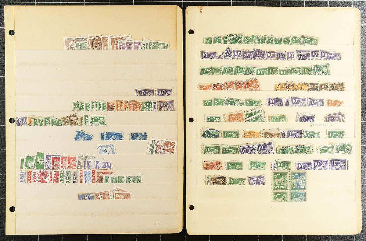 Old-time unpicked used accumulation of Sweden, 1870's-1979, containing a few thousand stamps in several homemade and manila stockpages. The lot has a degree of organization on some pages, generally ranging from Scott #17/1291, noting several Numeral issues, along with semi-postals and official stamps. The lot appears to be the collector duplicates, but some poking around spotted Scott #20 (x2, used, c.v. $80 total), along with accumulation of issues collected for town postmarks, leaving plenty of finds for the dedicated collector. A very worthwhile lot for the Sweden collector, and the first time on the market in several decades. Should be worth our conservative estimate. Estimate =