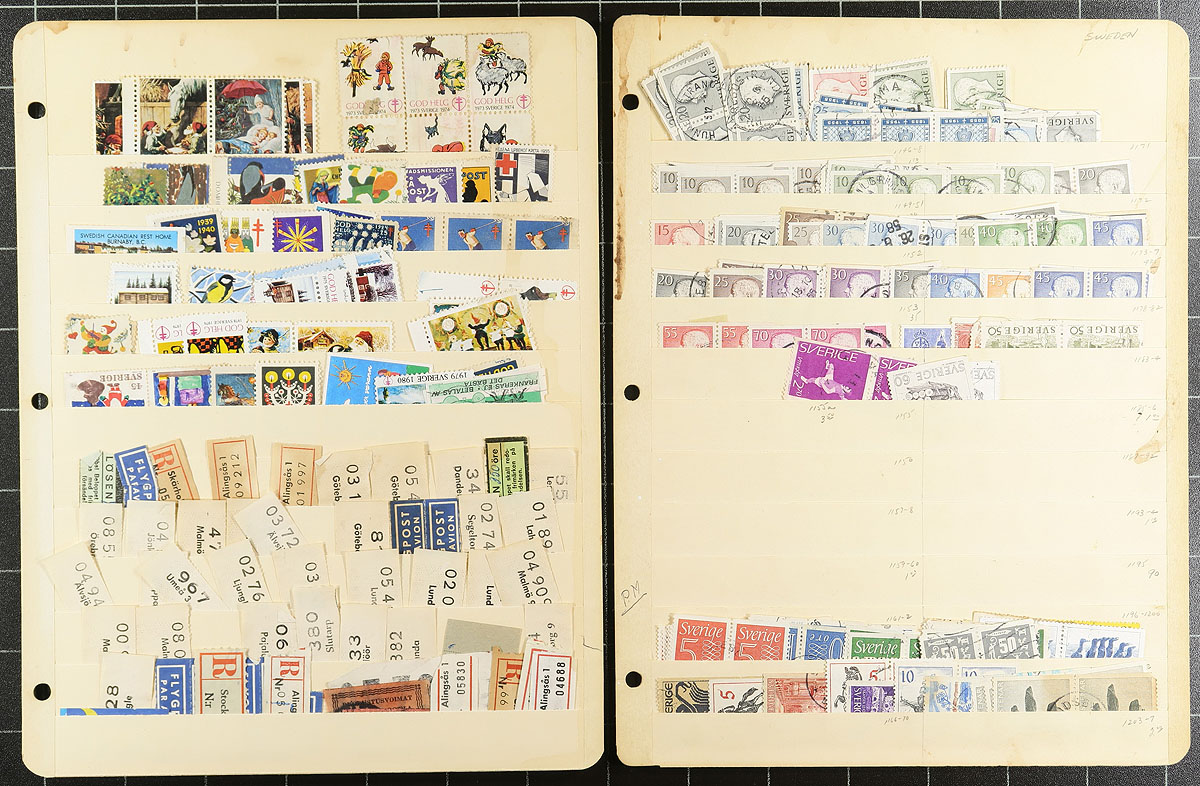 Old-time unpicked used accumulation of Sweden, 1870's-1979, containing a few thousand stamps in several homemade and manila stockpages. The lot has a degree of organization on some pages, generally ranging from Scott #17/1291, noting several Numeral issues, along with semi-postals and official stamps. The lot appears to be the collector duplicates, but some poking around spotted Scott #20 (x2, used, c.v. $80 total), along with accumulation of issues collected for town postmarks, leaving plenty of finds for the dedicated collector. A very worthwhile lot for the Sweden collector, and the first time on the market in several decades. Should be worth our conservative estimate. Estimate =