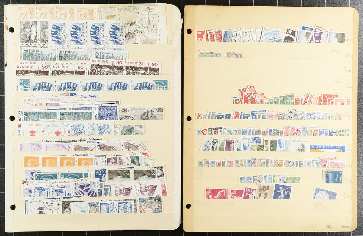 Old-time unpicked used accumulation of Sweden, 1870's-1979, containing a few thousand stamps in several homemade and manila stockpages. The lot has a degree of organization on some pages, generally ranging from Scott #17/1291, noting several Numeral issues, along with semi-postals and official stamps. The lot appears to be the collector duplicates, but some poking around spotted Scott #20 (x2, used, c.v. $80 total), along with accumulation of issues collected for town postmarks, leaving plenty of finds for the dedicated collector. A very worthwhile lot for the Sweden collector, and the first time on the market in several decades. Should be worth our conservative estimate. Estimate =
