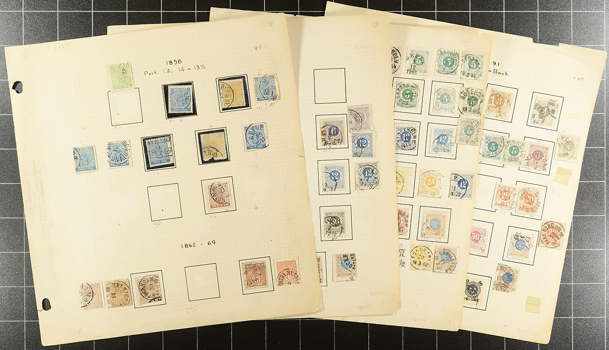 Classic collection of used Sweden, 1858-1889, containing just over 100 stamps on 4 old-time homemade album pages. The collection ranges from Scott #6/51, containing several stamps cataloguing $10 and up including #s 6, 10-11, 16 (x2), 20a ($67.50), 24 (x2, $70 total), 27 (x2, $190 total), 34 (x2), 44, 51, just to name a few. A nice classic collection of used issues, unchecked for better postmarks, and the first time on the market in decades, overall fine to very fine. 2026 Scott US$1,073.00 =
