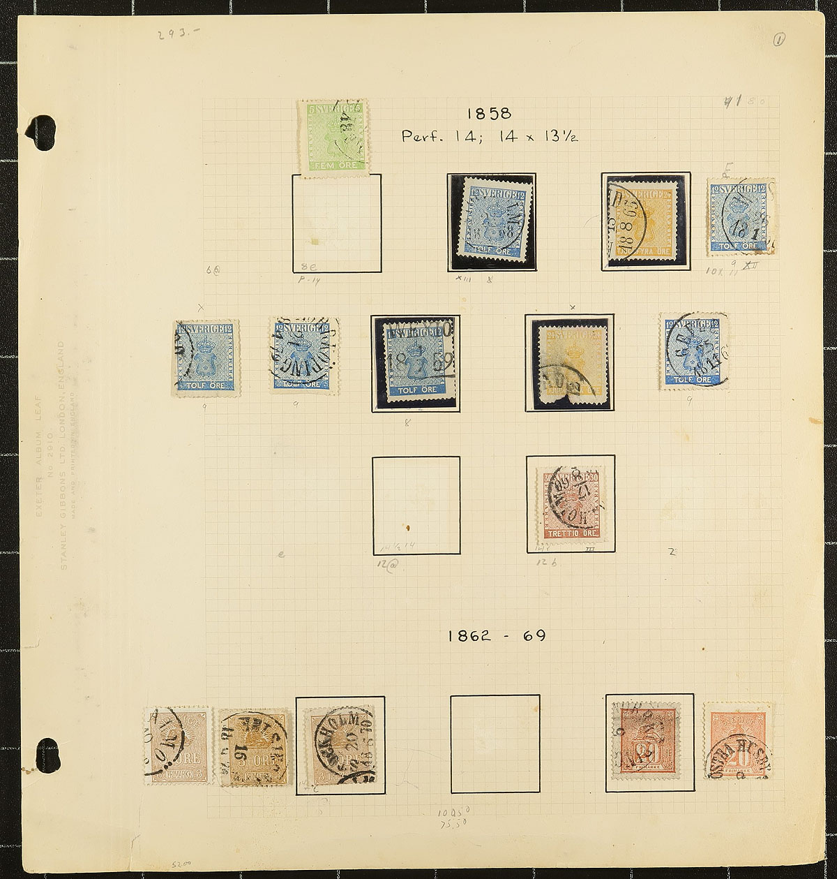 Classic collection of used Sweden, 1858-1889, containing just over 100 stamps on 4 old-time homemade album pages. The collection ranges from Scott #6/51, containing several stamps cataloguing $10 and up including #s 6, 10-11, 16 (x2), 20a ($67.50), 24 (x2, $70 total), 27 (x2, $190 total), 34 (x2), 44, 51, just to name a few. A nice classic collection of used issues, unchecked for better postmarks, and the first time on the market in decades, overall fine to very fine. 2026 Scott US$1,073.00 =