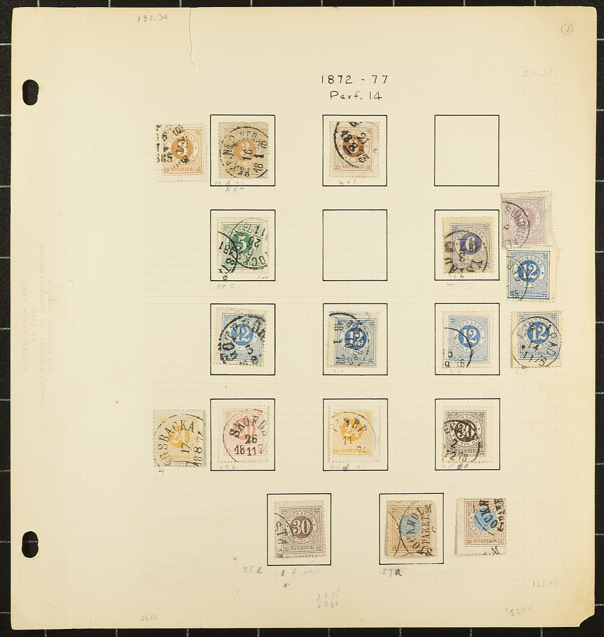 Classic collection of used Sweden, 1858-1889, containing just over 100 stamps on 4 old-time homemade album pages. The collection ranges from Scott #6/51, containing several stamps cataloguing $10 and up including #s 6, 10-11, 16 (x2), 20a ($67.50), 24 (x2, $70 total), 27 (x2, $190 total), 34 (x2), 44, 51, just to name a few. A nice classic collection of used issues, unchecked for better postmarks, and the first time on the market in decades, overall fine to very fine. 2026 Scott US$1,073.00 =