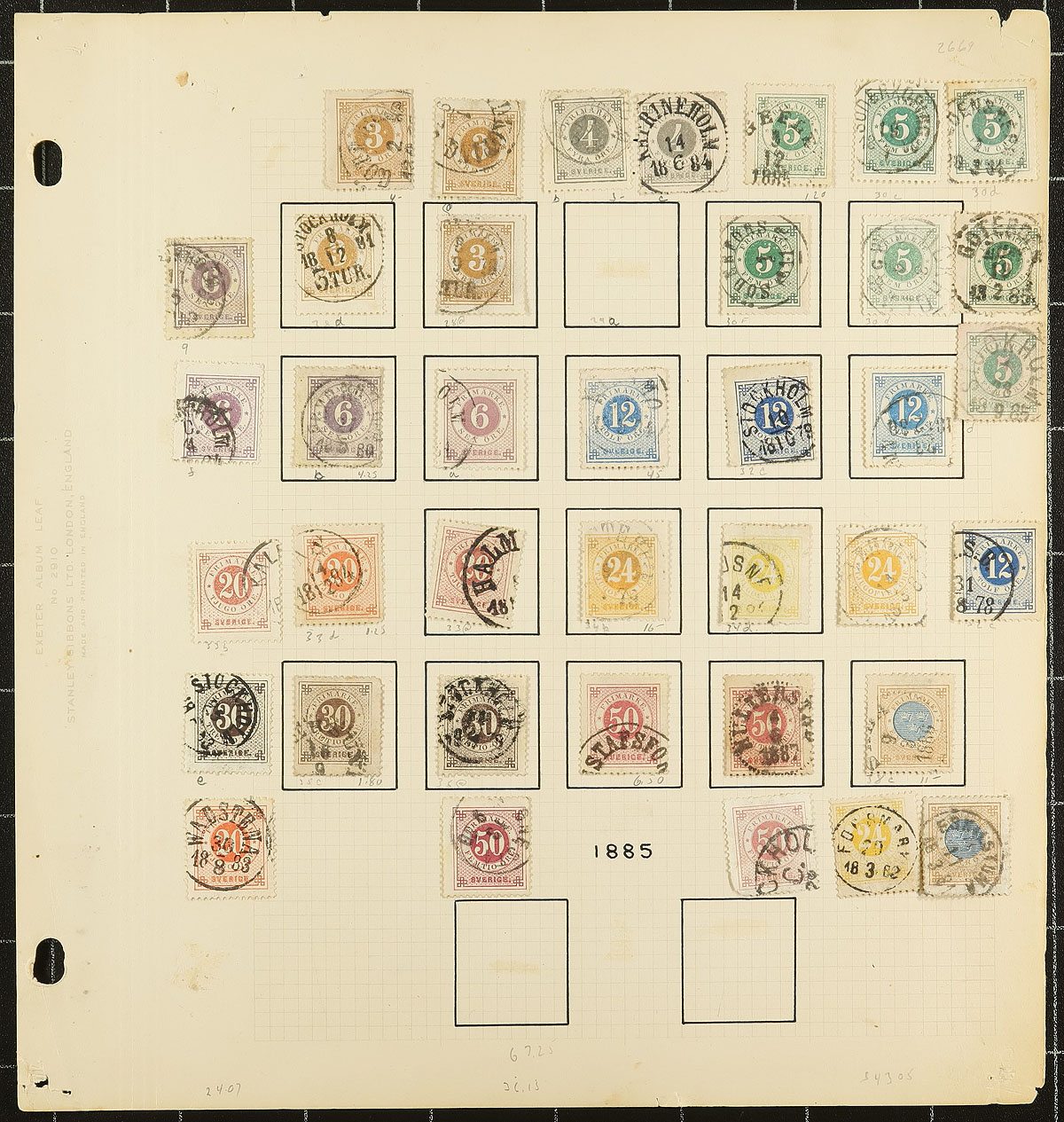 Classic collection of used Sweden, 1858-1889, containing just over 100 stamps on 4 old-time homemade album pages. The collection ranges from Scott #6/51, containing several stamps cataloguing $10 and up including #s 6, 10-11, 16 (x2), 20a ($67.50), 24 (x2, $70 total), 27 (x2, $190 total), 34 (x2), 44, 51, just to name a few. A nice classic collection of used issues, unchecked for better postmarks, and the first time on the market in decades, overall fine to very fine. 2026 Scott US$1,073.00 =