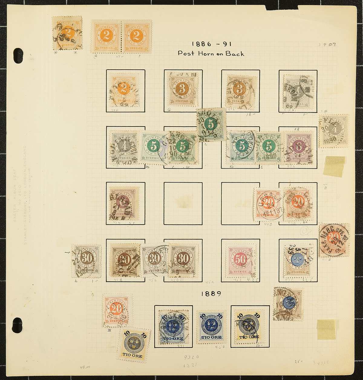 Classic collection of used Sweden, 1858-1889, containing just over 100 stamps on 4 old-time homemade album pages. The collection ranges from Scott #6/51, containing several stamps cataloguing $10 and up including #s 6, 10-11, 16 (x2), 20a ($67.50), 24 (x2, $70 total), 27 (x2, $190 total), 34 (x2), 44, 51, just to name a few. A nice classic collection of used issues, unchecked for better postmarks, and the first time on the market in decades, overall fine to very fine. 2026 Scott US$1,073.00 =
