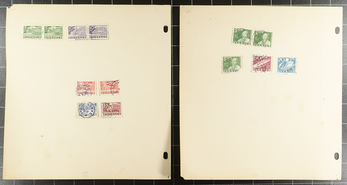 Old-time collection of mint and used Sweden, 1900-1949, containing several hundreds of stamps on several homemade pages. The collection generally ranges from Scott #65/414, containing mint and or used singles, sets, coils (including pairs), blocks, semi-postals, airmails, and a few first day covers. We note some stamps, sets, and partial sets cataloguing $10 to $30 each, including Scott #248-262 (mint and used set, c.v. $135.80 total. Duplication up to 10 for some issues, but does not account for the possible perforation, shade, watermark differences. A very nice lot that has not been on the market in decades. Overall fine too very fine. 2026 Scott US$725.95 =