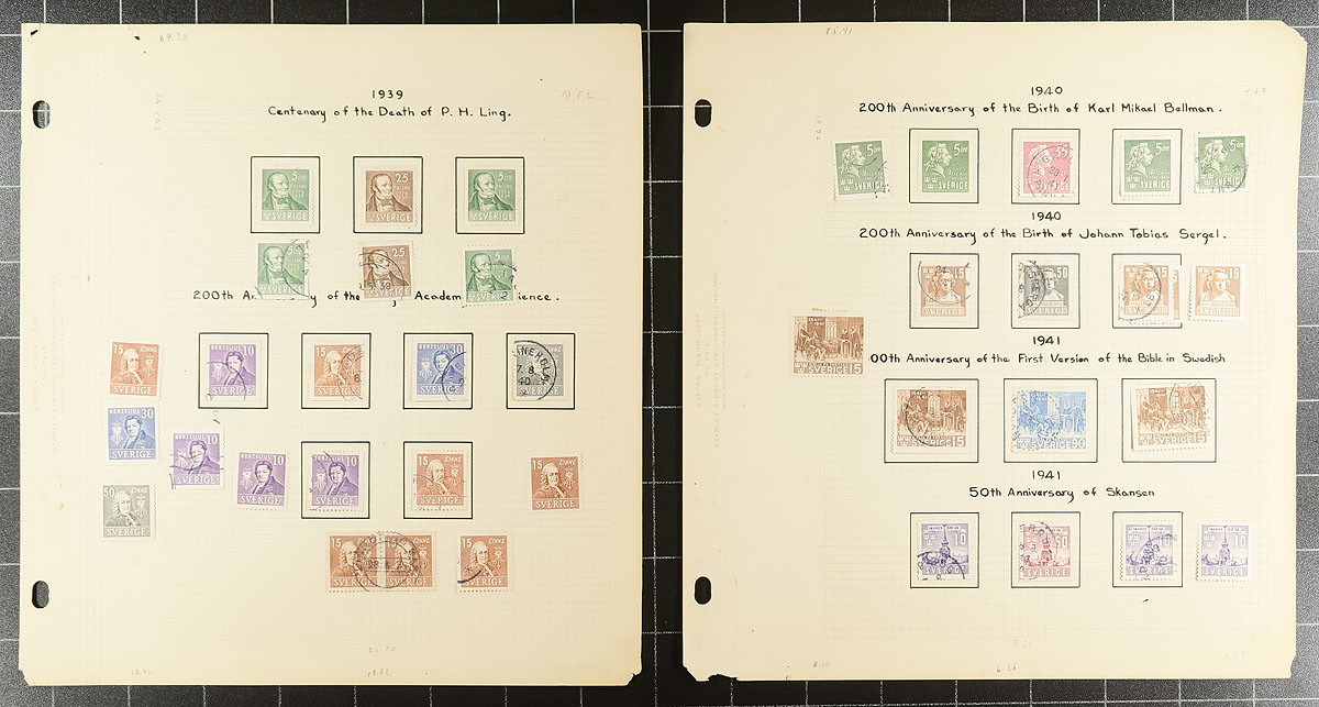 Old-time collection of mint and used Sweden, 1900-1949, containing several hundreds of stamps on several homemade pages. The collection generally ranges from Scott #65/414, containing mint and or used singles, sets, coils (including pairs), blocks, semi-postals, airmails, and a few first day covers. We note some stamps, sets, and partial sets cataloguing $10 to $30 each, including Scott #248-262 (mint and used set, c.v. $135.80 total. Duplication up to 10 for some issues, but does not account for the possible perforation, shade, watermark differences. A very nice lot that has not been on the market in decades. Overall fine too very fine. 2026 Scott US$725.95 =