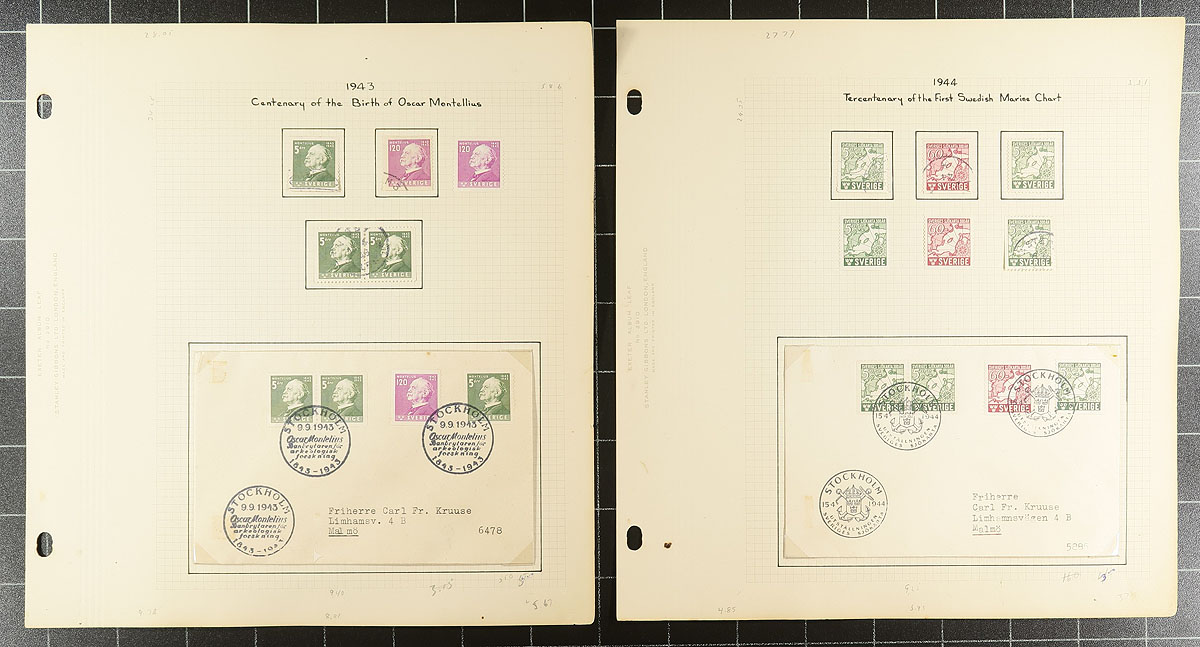 Old-time collection of mint and used Sweden, 1900-1949, containing several hundreds of stamps on several homemade pages. The collection generally ranges from Scott #65/414, containing mint and or used singles, sets, coils (including pairs), blocks, semi-postals, airmails, and a few first day covers. We note some stamps, sets, and partial sets cataloguing $10 to $30 each, including Scott #248-262 (mint and used set, c.v. $135.80 total. Duplication up to 10 for some issues, but does not account for the possible perforation, shade, watermark differences. A very nice lot that has not been on the market in decades. Overall fine too very fine. 2026 Scott US$725.95 =