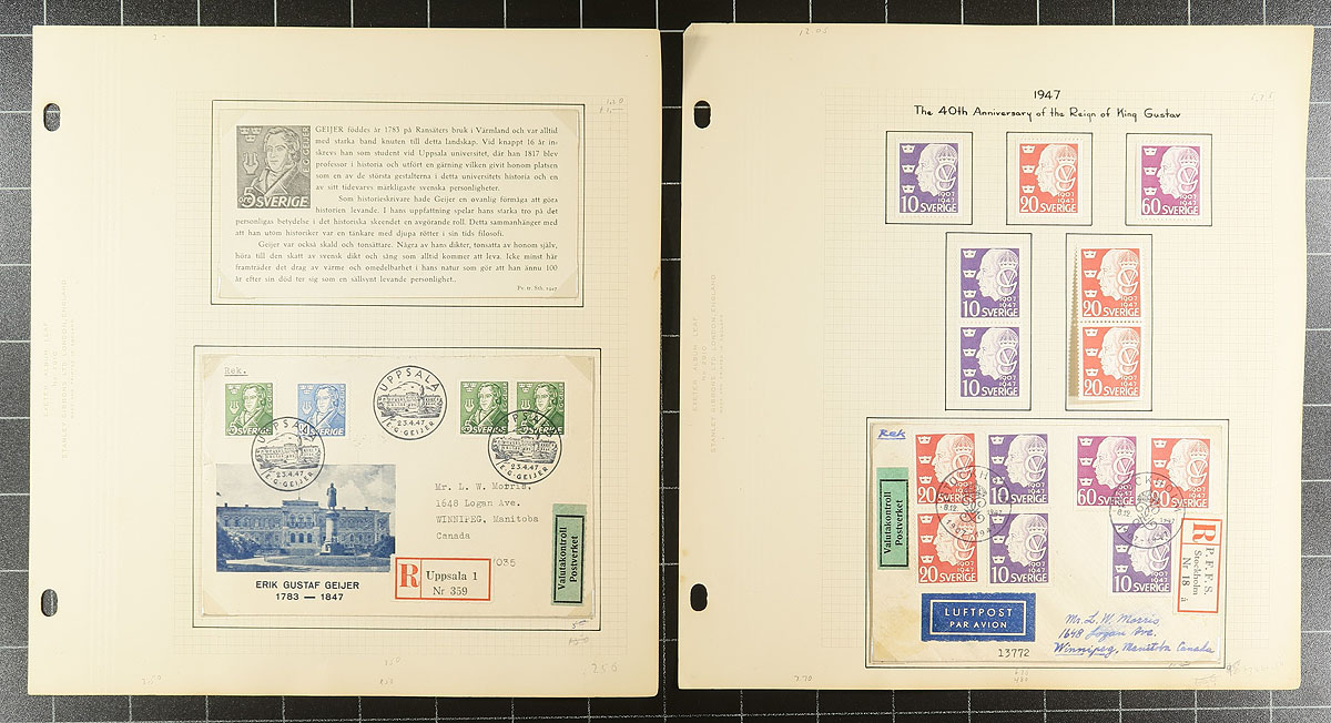 Old-time collection of mint and used Sweden, 1900-1949, containing several hundreds of stamps on several homemade pages. The collection generally ranges from Scott #65/414, containing mint and or used singles, sets, coils (including pairs), blocks, semi-postals, airmails, and a few first day covers. We note some stamps, sets, and partial sets cataloguing $10 to $30 each, including Scott #248-262 (mint and used set, c.v. $135.80 total. Duplication up to 10 for some issues, but does not account for the possible perforation, shade, watermark differences. A very nice lot that has not been on the market in decades. Overall fine too very fine. 2026 Scott US$725.95 =