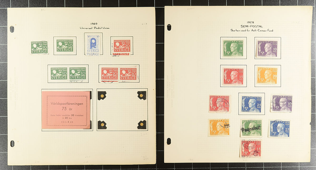 Old-time collection of mint and used Sweden, 1900-1949, containing several hundreds of stamps on several homemade pages. The collection generally ranges from Scott #65/414, containing mint and or used singles, sets, coils (including pairs), blocks, semi-postals, airmails, and a few first day covers. We note some stamps, sets, and partial sets cataloguing $10 to $30 each, including Scott #248-262 (mint and used set, c.v. $135.80 total. Duplication up to 10 for some issues, but does not account for the possible perforation, shade, watermark differences. A very nice lot that has not been on the market in decades. Overall fine too very fine. 2026 Scott US$725.95 =
