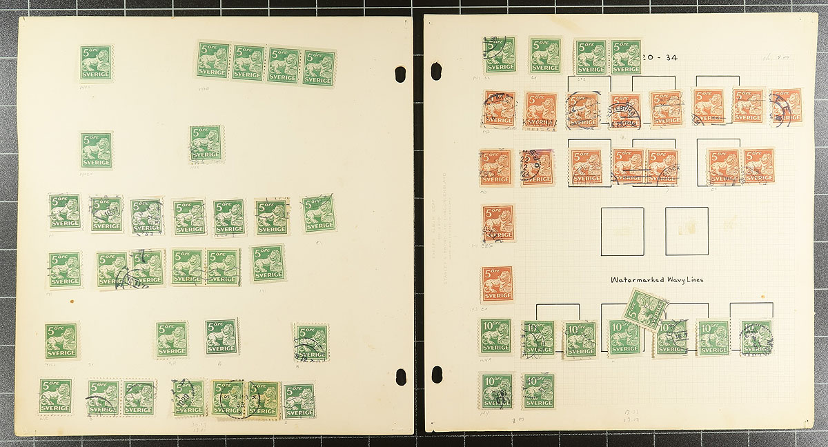 Old-time collection of mint and used Sweden, 1900-1949, containing several hundreds of stamps on several homemade pages. The collection generally ranges from Scott #65/414, containing mint and or used singles, sets, coils (including pairs), blocks, semi-postals, airmails, and a few first day covers. We note some stamps, sets, and partial sets cataloguing $10 to $30 each, including Scott #248-262 (mint and used set, c.v. $135.80 total. Duplication up to 10 for some issues, but does not account for the possible perforation, shade, watermark differences. A very nice lot that has not been on the market in decades. Overall fine too very fine. 2026 Scott US$725.95 =