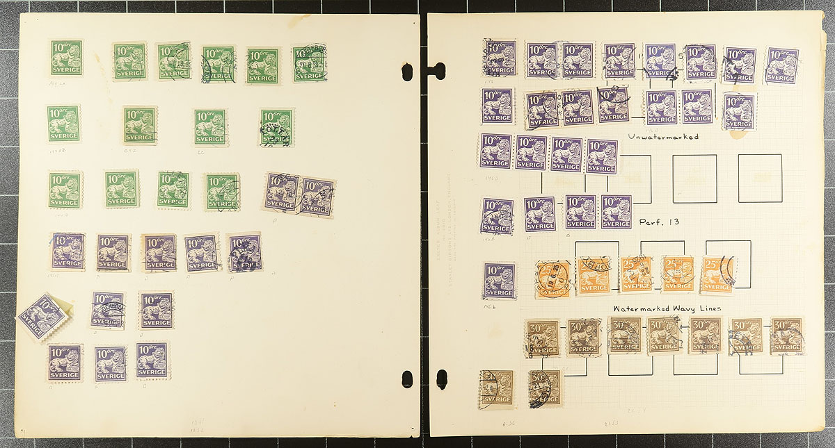Old-time collection of mint and used Sweden, 1900-1949, containing several hundreds of stamps on several homemade pages. The collection generally ranges from Scott #65/414, containing mint and or used singles, sets, coils (including pairs), blocks, semi-postals, airmails, and a few first day covers. We note some stamps, sets, and partial sets cataloguing $10 to $30 each, including Scott #248-262 (mint and used set, c.v. $135.80 total. Duplication up to 10 for some issues, but does not account for the possible perforation, shade, watermark differences. A very nice lot that has not been on the market in decades. Overall fine too very fine. 2026 Scott US$725.95 =