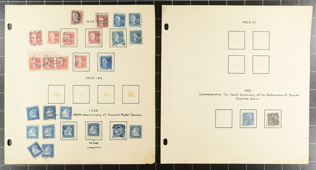 Old-time collection of mint and used Sweden, 1900-1949, containing several hundreds of stamps on several homemade pages. The collection generally ranges from Scott #65/414, containing mint and or used singles, sets, coils (including pairs), blocks, semi-postals, airmails, and a few first day covers. We note some stamps, sets, and partial sets cataloguing $10 to $30 each, including Scott #248-262 (mint and used set, c.v. $135.80 total. Duplication up to 10 for some issues, but does not account for the possible perforation, shade, watermark differences. A very nice lot that has not been on the market in decades. Overall fine too very fine. 2026 Scott US$725.95 =