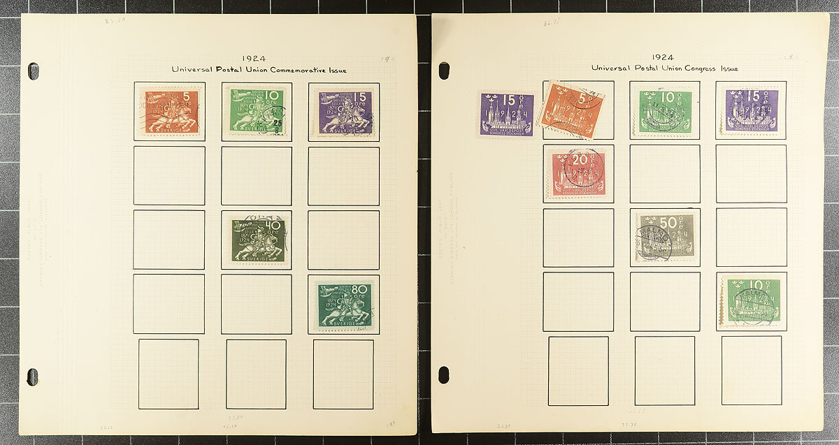 Old-time collection of mint and used Sweden, 1900-1949, containing several hundreds of stamps on several homemade pages. The collection generally ranges from Scott #65/414, containing mint and or used singles, sets, coils (including pairs), blocks, semi-postals, airmails, and a few first day covers. We note some stamps, sets, and partial sets cataloguing $10 to $30 each, including Scott #248-262 (mint and used set, c.v. $135.80 total. Duplication up to 10 for some issues, but does not account for the possible perforation, shade, watermark differences. A very nice lot that has not been on the market in decades. Overall fine too very fine. 2026 Scott US$725.95 =