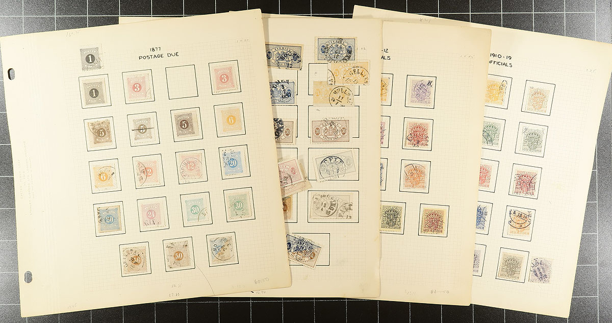 Classic collection of mint and used Sweden back of the book issues, 1877-1919, containing just over 100 stamps on 4 old-time homemade pages. The collection contains primarily used postage due and parcel post issues, noting some items cataloguing $10 and upp each including #s J18, J22, O3 ($52.50), O4 (x3, c.v. $195 total), O23 (x2, $50 total), just to name a few. A nice classic collection from this popular collecting country. Overall fine to very fine. 2026 Scott US$721.20 =