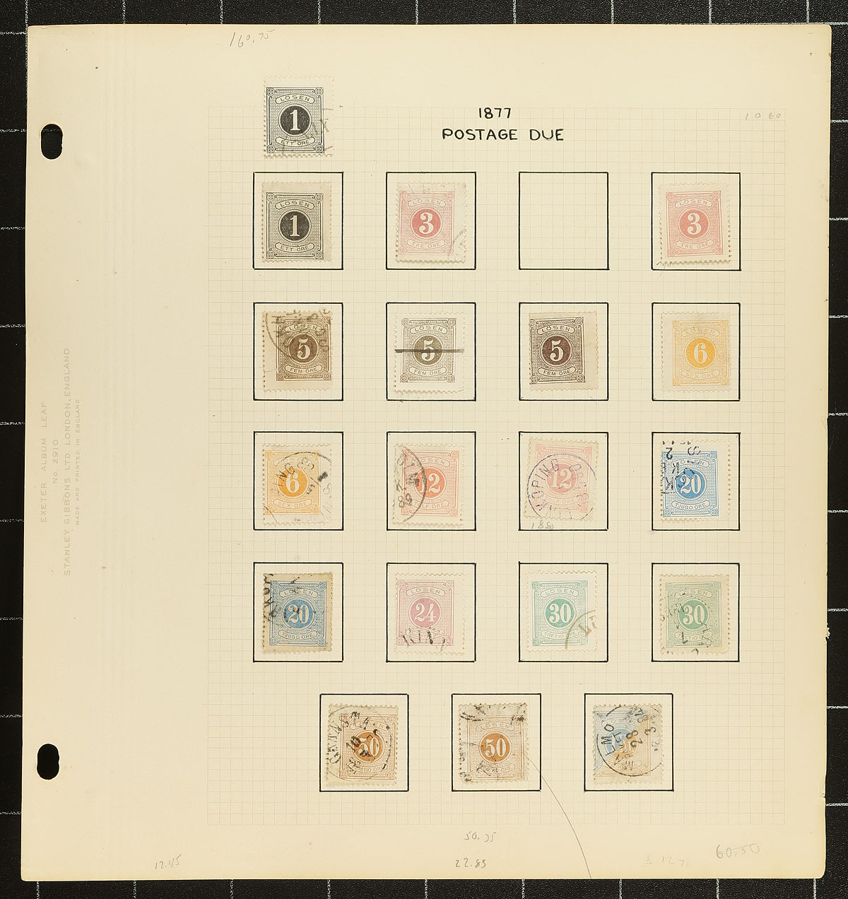 Classic collection of mint and used Sweden back of the book issues, 1877-1919, containing just over 100 stamps on 4 old-time homemade pages. The collection contains primarily used postage due and parcel post issues, noting some items cataloguing $10 and upp each including #s J18, J22, O3 ($52.50), O4 (x3, c.v. $195 total), O23 (x2, $50 total), just to name a few. A nice classic collection from this popular collecting country. Overall fine to very fine. 2026 Scott US$721.20 =