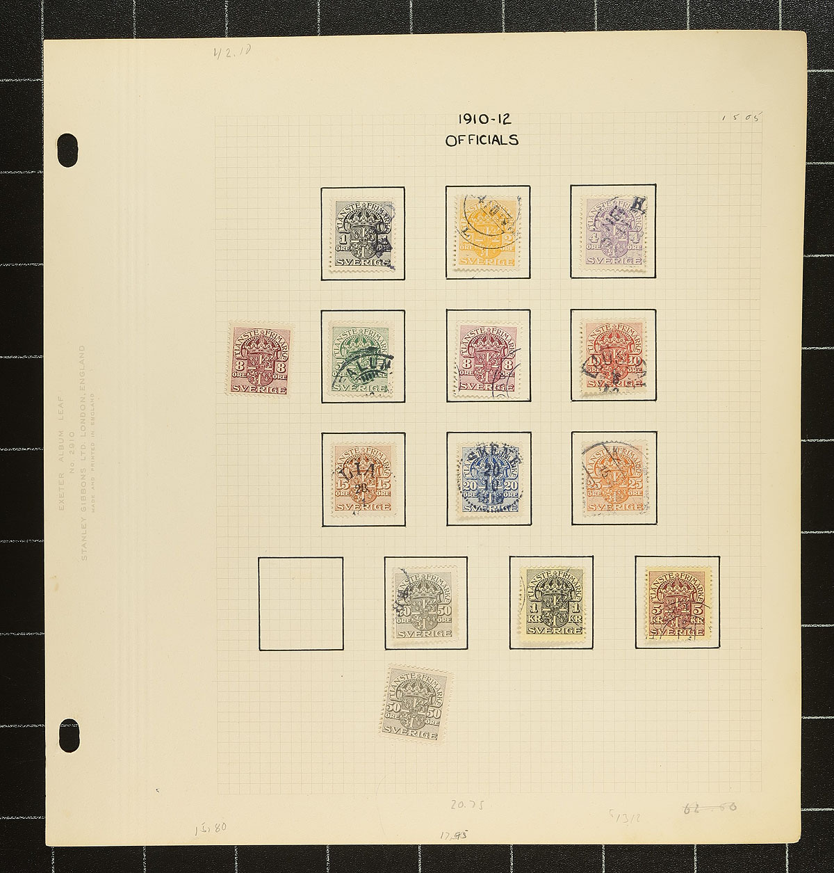 Classic collection of mint and used Sweden back of the book issues, 1877-1919, containing just over 100 stamps on 4 old-time homemade pages. The collection contains primarily used postage due and parcel post issues, noting some items cataloguing $10 and upp each including #s J18, J22, O3 ($52.50), O4 (x3, c.v. $195 total), O23 (x2, $50 total), just to name a few. A nice classic collection from this popular collecting country. Overall fine to very fine. 2026 Scott US$721.20 =