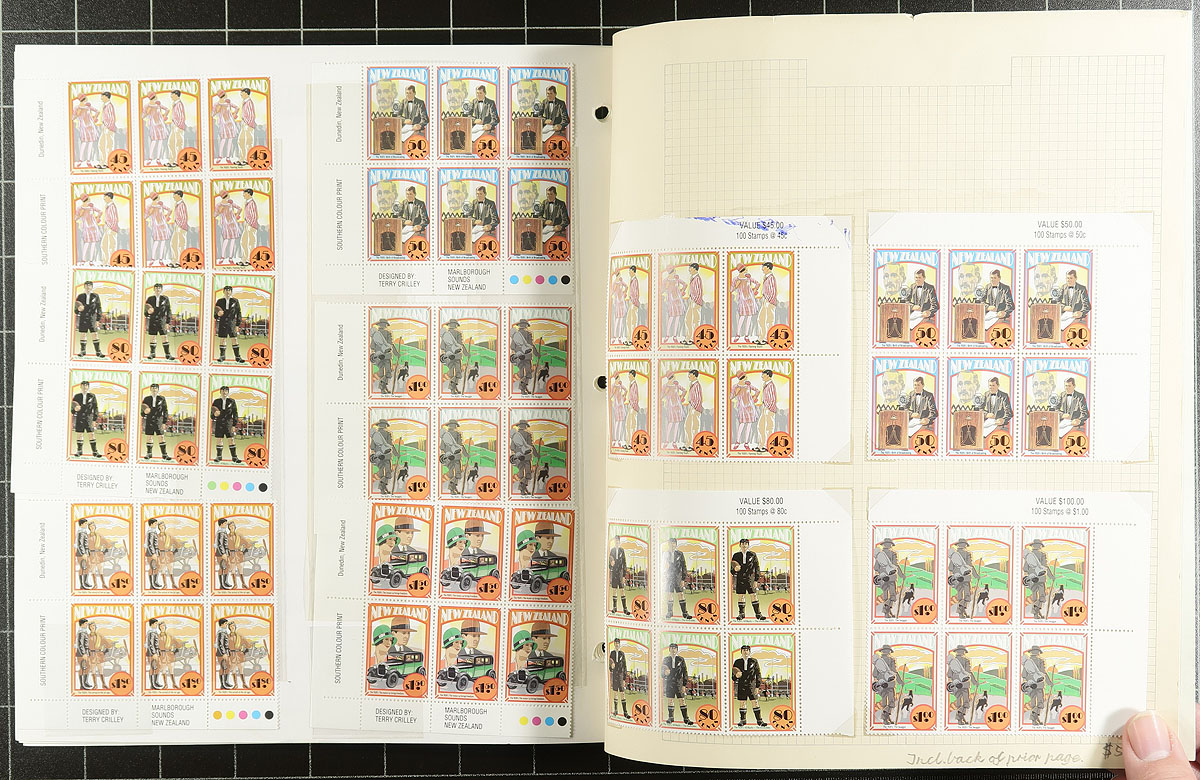 Collection of primarily never hinged New Zealand, 1953-2007, containing many hundreds of stamps in several album or stock pages. The lot generally ranges from Scott #285/2161, containing several sets, along with a few blocks and souvenir sheets, with the bulk of material post-1980. A spot check indicated some material cataloguing $10 and up, with the owner's 2015 Scott catalogue value for the lot totaling US$772.00. Face value alone would be at least a few hundred dollars. A nice clean lot with mild duplication possible, overall fine to very fine. Estimate =