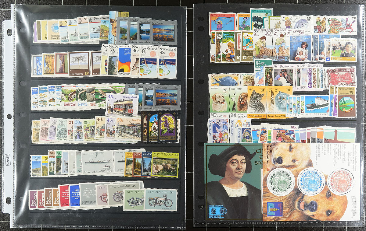 Collection of primarily never hinged New Zealand, 1953-2007, containing many hundreds of stamps in several album or stock pages. The lot generally ranges from Scott #285/2161, containing several sets, along with a few blocks and souvenir sheets, with the bulk of material post-1980. A spot check indicated some material cataloguing $10 and up, with the owner's 2015 Scott catalogue value for the lot totaling US$772.00. Face value alone would be at least a few hundred dollars. A nice clean lot with mild duplication possible, overall fine to very fine. Estimate =