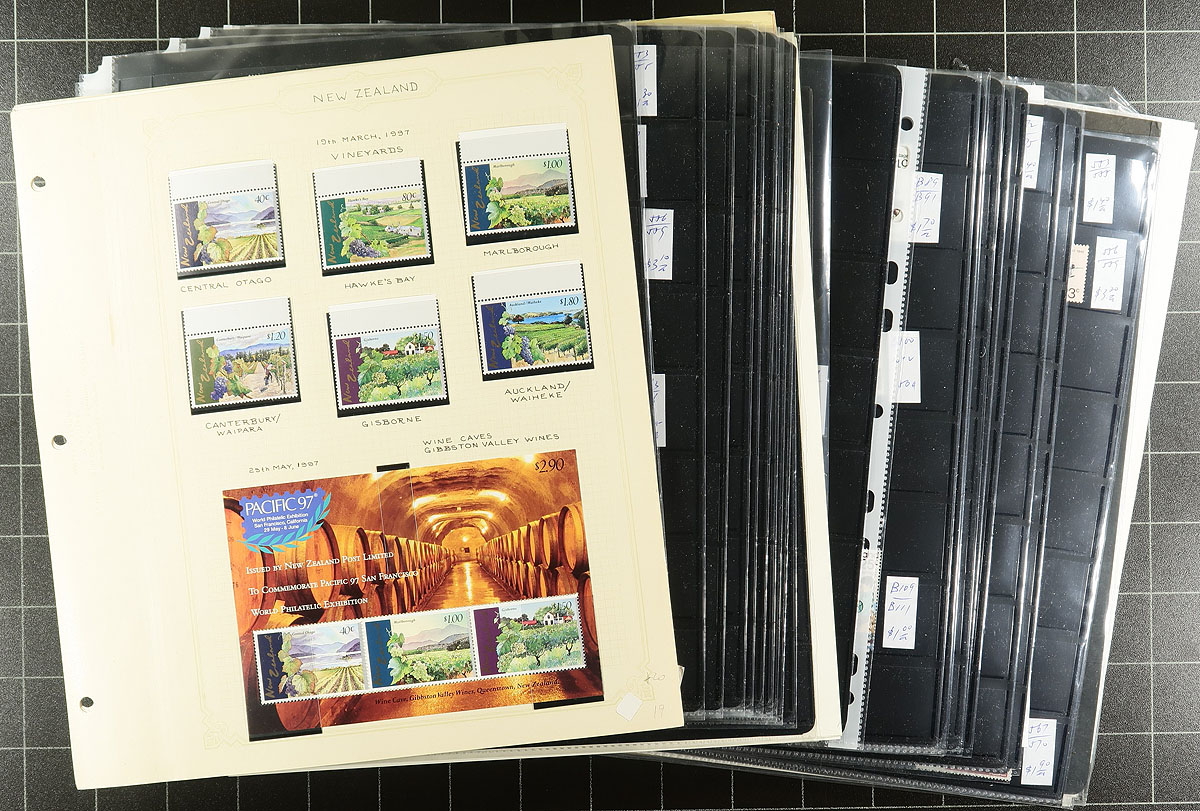 Collection of primarily never hinged New Zealand, 1958-1997, containing several hundreds of stamps in many album or stock pages. The lot generally ranges from Scott #322/1434, containing several sets, along with a few souvenir sheets, booklet panes, and back of the book items. A spot check indicated material cataloguing $5 to $15 each, with many of the stamps identified and priced by the owner. The owner's 2016 Scott catalogue value for the lot totals US$745.00, and face value alone is likely a few hundred dollars as most material ranges from the 1970's to the 1980's. A nice lot for all collectors. Estimate =