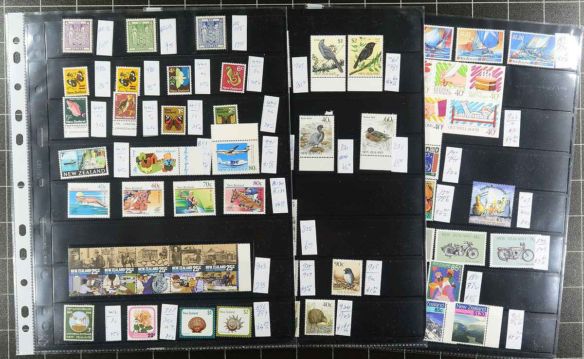 Collection of primarily never hinged New Zealand, 1958-1997, containing several hundreds of stamps in many album or stock pages. The lot generally ranges from Scott #322/1434, containing several sets, along with a few souvenir sheets, booklet panes, and back of the book items. A spot check indicated material cataloguing $5 to $15 each, with many of the stamps identified and priced by the owner. The owner's 2016 Scott catalogue value for the lot totals US$745.00, and face value alone is likely a few hundred dollars as most material ranges from the 1970's to the 1980's. A nice lot for all collectors. Estimate =