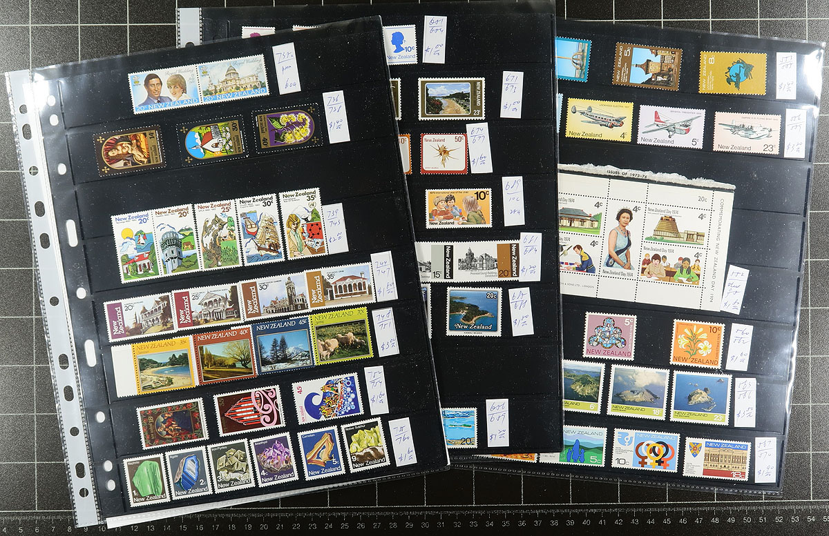 Collection of primarily never hinged New Zealand, 1958-1997, containing several hundreds of stamps in many album or stock pages. The lot generally ranges from Scott #322/1434, containing several sets, along with a few souvenir sheets, booklet panes, and back of the book items. A spot check indicated material cataloguing $5 to $15 each, with many of the stamps identified and priced by the owner. The owner's 2016 Scott catalogue value for the lot totals US$745.00, and face value alone is likely a few hundred dollars as most material ranges from the 1970's to the 1980's. A nice lot for all collectors. Estimate =