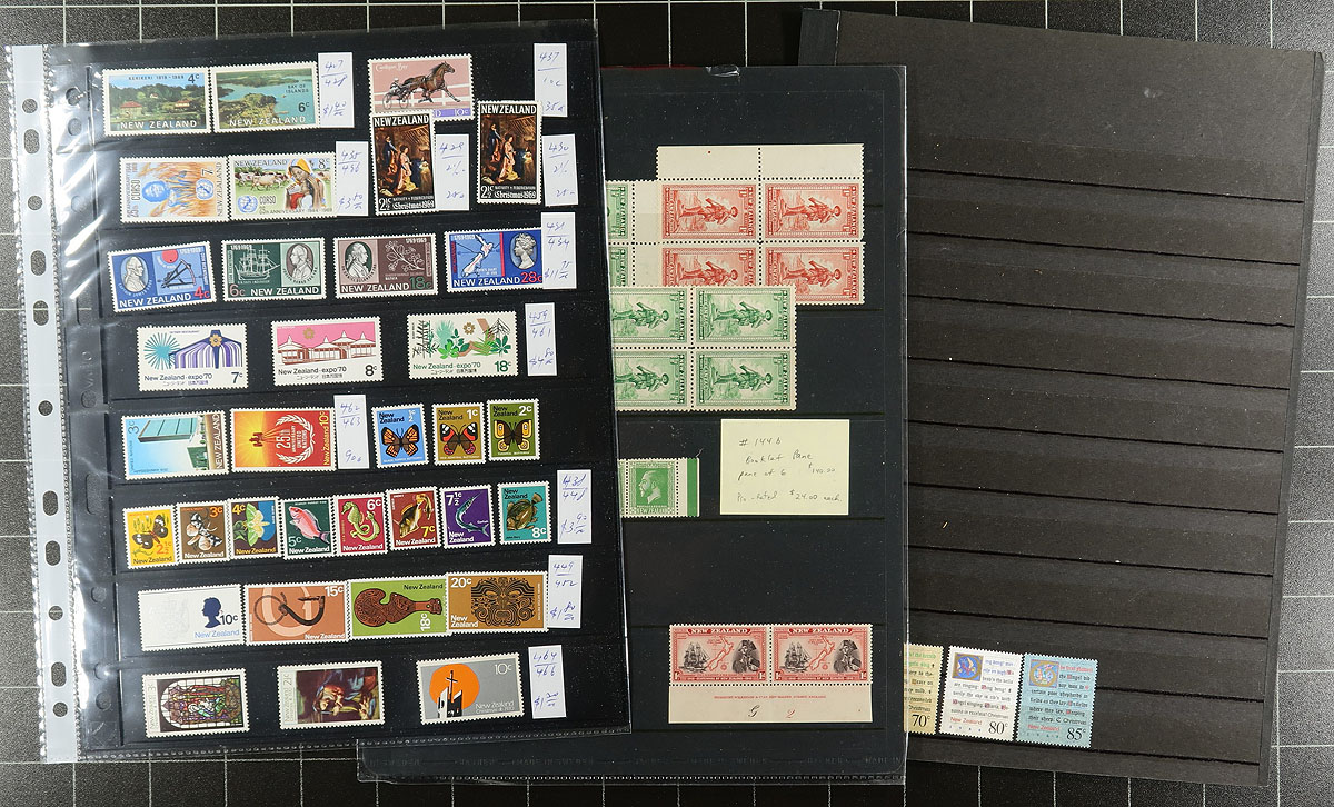 Collection of primarily never hinged New Zealand, 1958-1997, containing several hundreds of stamps in many album or stock pages. The lot generally ranges from Scott #322/1434, containing several sets, along with a few souvenir sheets, booklet panes, and back of the book items. A spot check indicated material cataloguing $5 to $15 each, with many of the stamps identified and priced by the owner. The owner's 2016 Scott catalogue value for the lot totals US$745.00, and face value alone is likely a few hundred dollars as most material ranges from the 1970's to the 1980's. A nice lot for all collectors. Estimate =