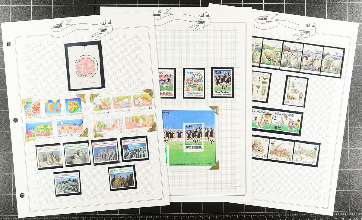 Collection of primarily never hinged New Zealand, 1958-1997, containing several hundreds of stamps in many album or stock pages. The lot generally ranges from Scott #322/1434, containing several sets, along with a few souvenir sheets, booklet panes, and back of the book items. A spot check indicated material cataloguing $5 to $15 each, with many of the stamps identified and priced by the owner. The owner's 2016 Scott catalogue value for the lot totals US$745.00, and face value alone is likely a few hundred dollars as most material ranges from the 1970's to the 1980's. A nice lot for all collectors. Estimate =