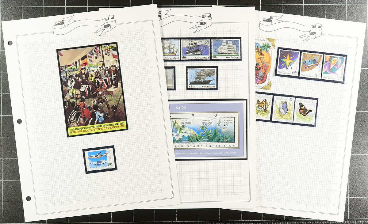 Collection of primarily never hinged New Zealand, 1958-1997, containing several hundreds of stamps in many album or stock pages. The lot generally ranges from Scott #322/1434, containing several sets, along with a few souvenir sheets, booklet panes, and back of the book items. A spot check indicated material cataloguing $5 to $15 each, with many of the stamps identified and priced by the owner. The owner's 2016 Scott catalogue value for the lot totals US$745.00, and face value alone is likely a few hundred dollars as most material ranges from the 1970's to the 1980's. A nice lot for all collectors. Estimate =