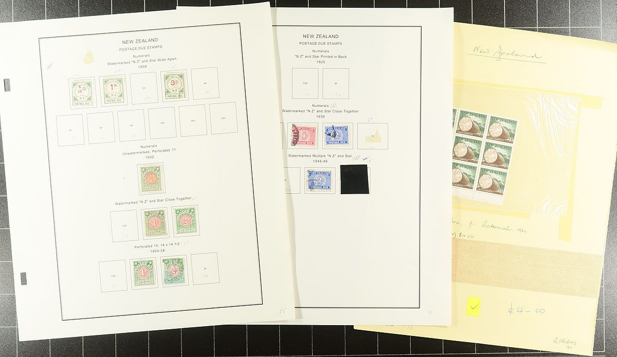 Collection of primarily never hinged New Zealand, 1958-1997, containing several hundreds of stamps in many album or stock pages. The lot generally ranges from Scott #322/1434, containing several sets, along with a few souvenir sheets, booklet panes, and back of the book items. A spot check indicated material cataloguing $5 to $15 each, with many of the stamps identified and priced by the owner. The owner's 2016 Scott catalogue value for the lot totals US$745.00, and face value alone is likely a few hundred dollars as most material ranges from the 1970's to the 1980's. A nice lot for all collectors. Estimate =