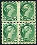 VG/Fine mint Never Hinged block of four of the 2c green Small Queen. Nice rich/deep colour. Accompanied with 2022 PSE (Professional Stamp Experts) graded certificate, giving a grade of "VG 50, Mint OGnh". 2026 Scott US$800.00 =