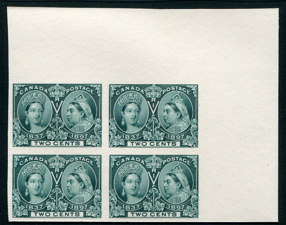 Proof on card in deep green of the 2c 1897 Jubilee issue in a choice quality upper right sheet margin corner block of four. A top quality addition to any Jubilee collection. The catalogue does not list premiums on proof multiples / corners, but they surely deserve it. Valued as four singles. 2025-2026 Unitrade =