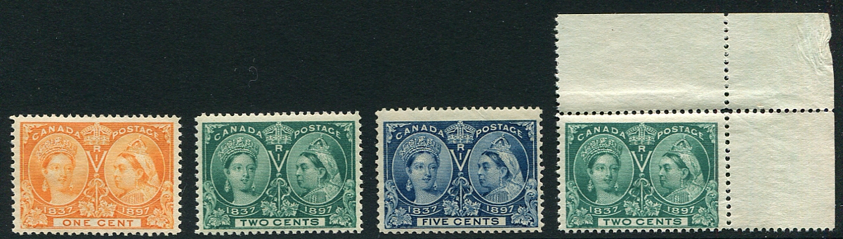 A lovely mint Never Hinged quartet of 1897 Queen Victoria Jubilee's, including the 1c orange, 2c green (x2) and 5c deep blue. The 1c and 2c singles (on the left) are particularly well centered, with the extra example of the 2c value being a premium upper-right sheet-margin single. 2026 Scott US$460.00 =