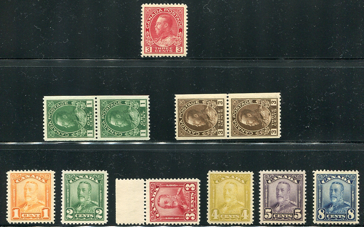 VF mint Never Hinged George V selection, including the 3c carmine Admiral, 1c green / 3c brown Admiral perf 12 coils (in pairs) and finishing with the run of 1c to 8c George V "Scroll" issues. 2026 Scott US$314.50 =