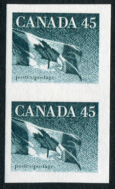 VF mint Never Hinged imperforate pair of the 1995 issue 45c blue green Flag coil on HB paper. An always popular (and quite affordable) QEII era variety. 2025-2026 Unitrade =