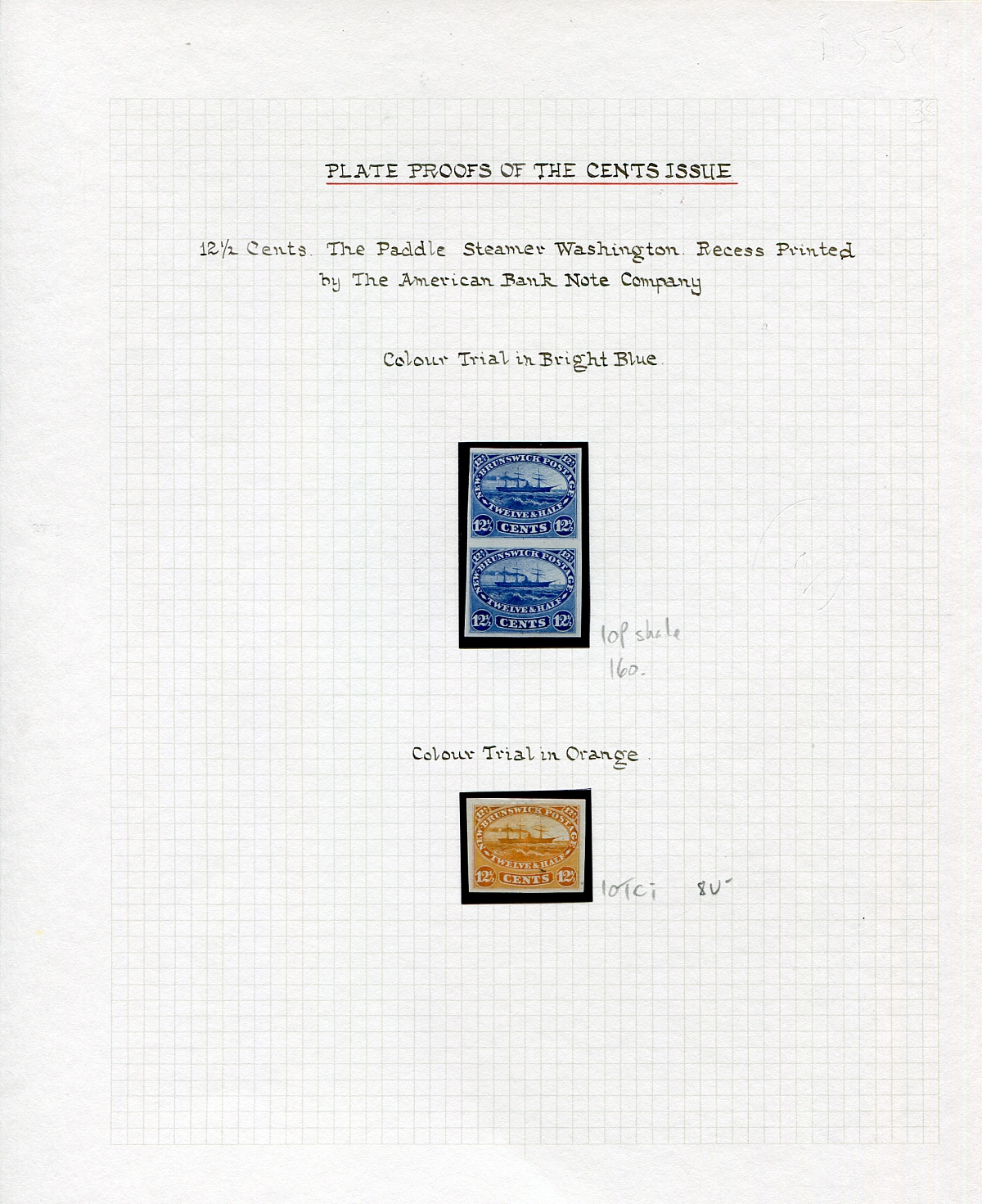 Attractive Proof / Trial Colour Proof pair and single of the 1860 issued 12 1/2c "Steam and Sailing Ship" Provincial issue, with the pair in bright blue, and colour trial in orange. 2025-2026 Unitrade =