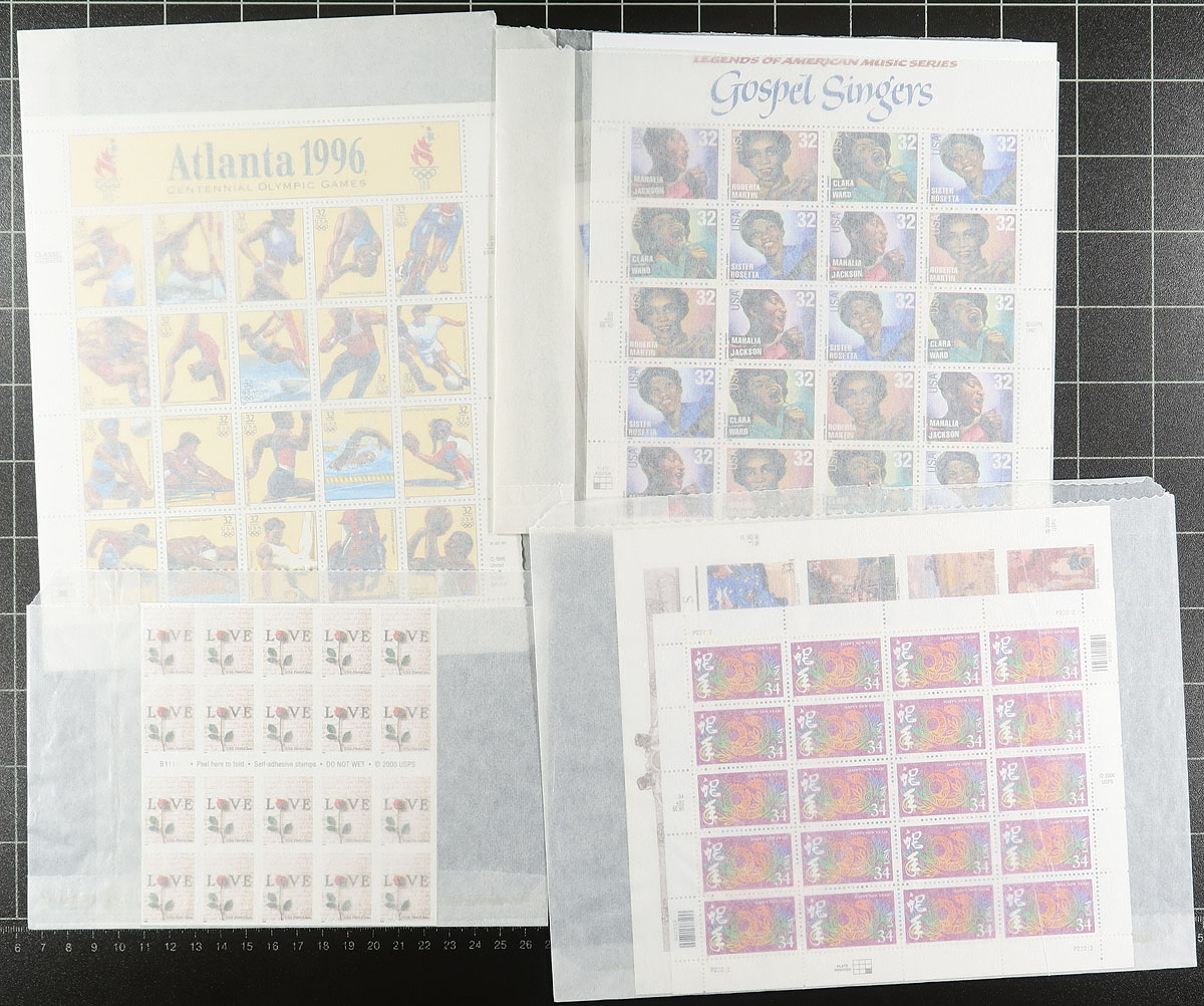 Modern Mint Madness. A collector's accumulation of mint USA from the 1990's / 2000's as ordered from the Canada Post (we didn't know you could do this, we unpacked these from the heavy Canada Post mailers). Comprising primarily of complete sheets, with the odd booklet / block included. Some popular issues here including Star Wars, Motorcycles, "Celebrate the Century", Disney, Loony Tunes, Lunar New Years etc. Counted only for the face value US$483.00 ($659.50 CDN). Estimate =