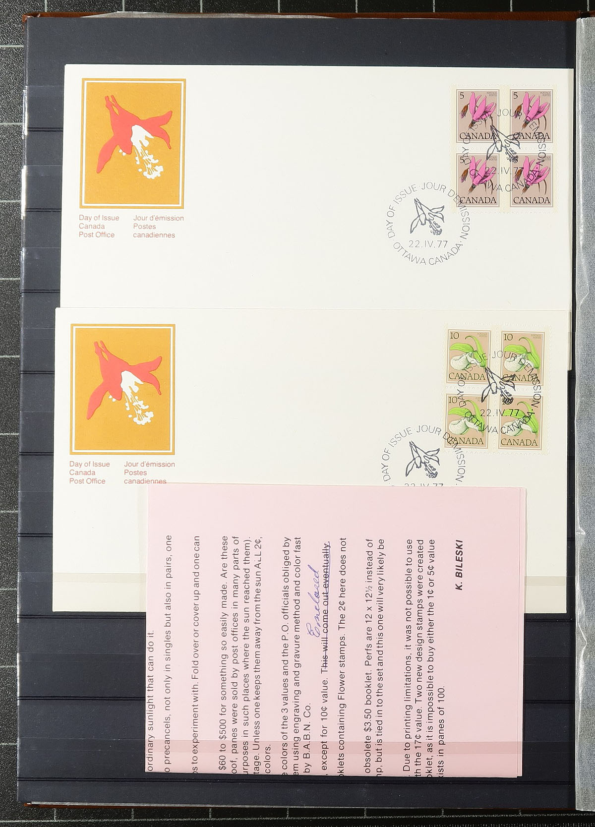 A 16-page Unisafe stockbook (in VF condition) containing Kasimir Bileski offerings. Noted "Stik-N-Tik", QEII Centennials, $2.00 Kluane paper varieties, Officials, FDC, $1.00 Vancouver Harbour, definitives, commemoratives "Pembina Local Post", "chewing gum" booklet panes and a smattering of Nicaragua. Many still with the always-interesting Bileski write-ups / pricing. Estimate =