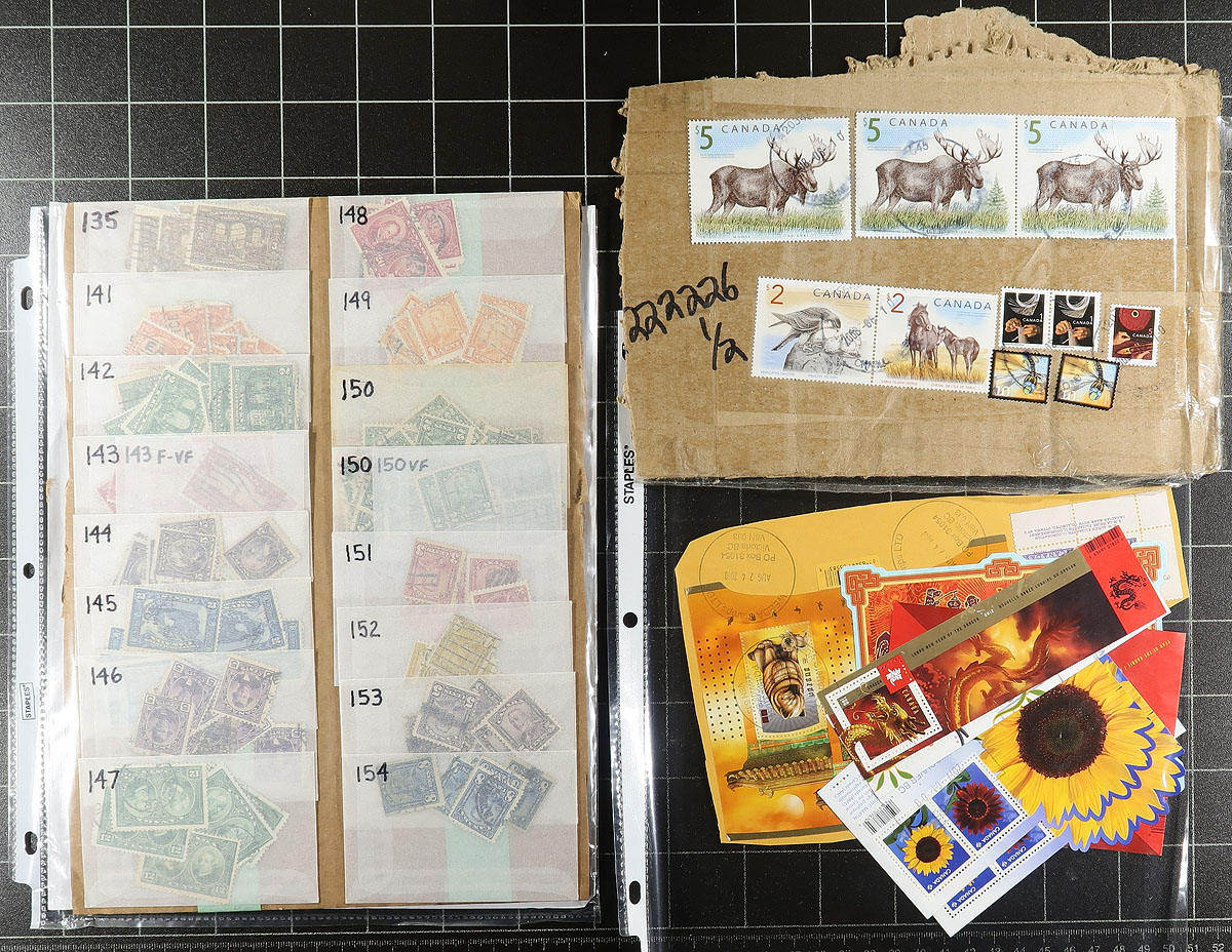 Box of Canadian "Catch All" #1. The first of three offerings in this sale, sure to please the philatelic sorter. Containing a wide-array of material, we did note mint and used including Admirals, Small Queens, Provinces, modern souvenir sheets, Post Office thematic packs and more! Many still on the original auction/bidboard cards from when originally purchased. Estimate =