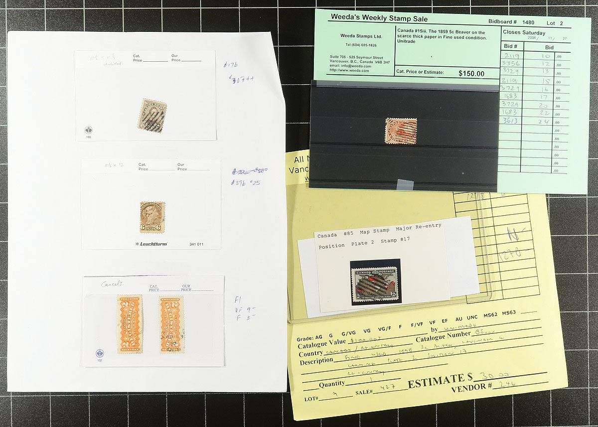 Box of Canadian "Catch All" #2. The second of three offerings in this sale, sure to please the philatelic sorter. Containing a wide-array of material, we did note mint and used including Admirals, Plate Blocks, Post Office packs, Post Office Thematic Collections, Officials etc! Many still on the original auction/bidboard cards from when originally purchased. Estimate =