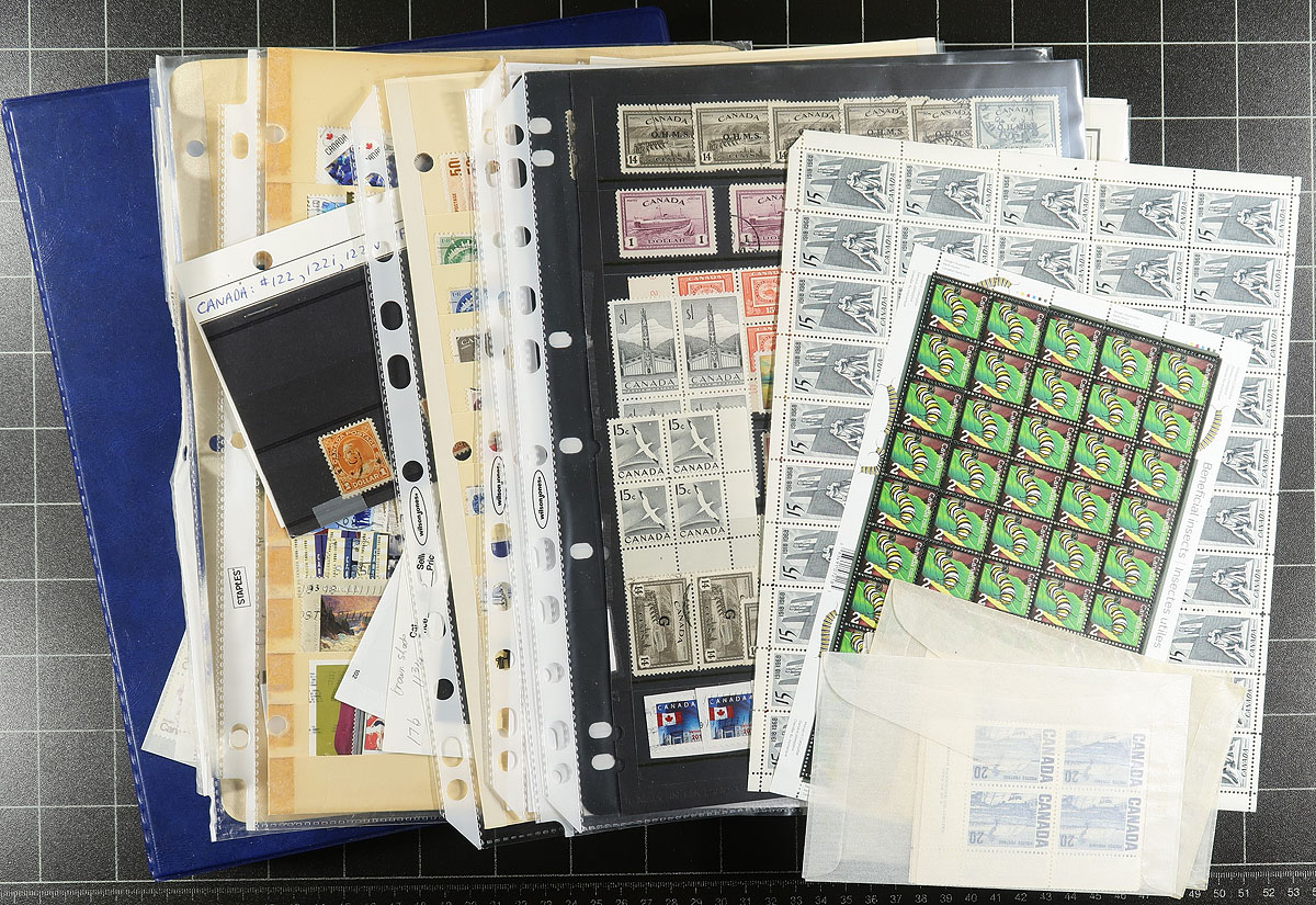Box of Canadian "Catch All" #3. The third and final of three offerings in this sale, sure to please the philatelic sorter. Containing a wide-array of material, we did note mint and used including Officials, Plate Blocks, early Canada, and 5x the $5.00 Fabric Flag (mint), plus more! Many still on the original auction/bidboard cards from when originally purchased. Estimate =